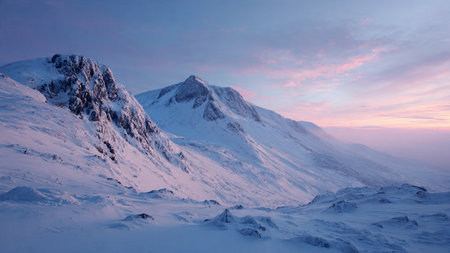 Sunrise creates a serene pastel palette over crystal-clear winter mountains.
