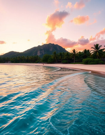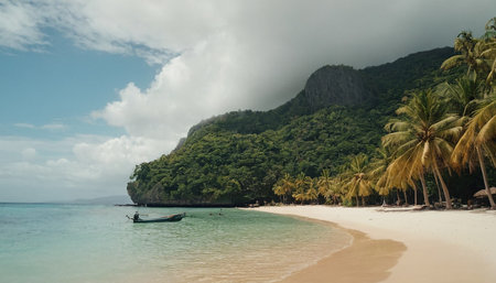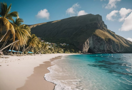 Tropical island paradise with white sand beach and turquoise waters awaiting relaxation