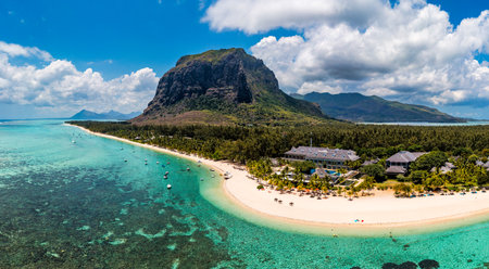 Aerial view of Le morne Brabant in Mauriutius. Tropical crystal ocean with Le Morne mountain and luxury beach in Mauritius. Le Morne beach with palm trees, white sand and luxury resorts, Mauritius.