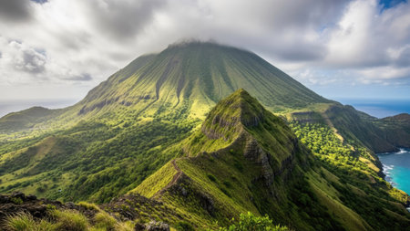 Lush green hills rise steeply from the coast, where turquoise waters gently lap against rocky shores. The sky is filled with dramatic clouds, enhancing the tranquil atmosphere.