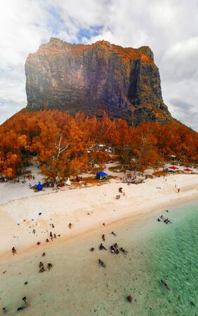 Le Morne Brabant in Mauritius. Amazing aerial view of beach, forest and mountain.