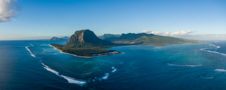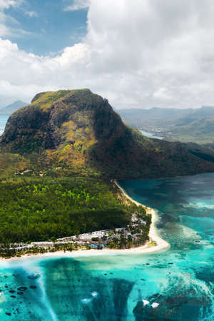Aerial view of Le Morne Brabant .Coral reef of the island of Mauritius. panorama underwater waterfall
