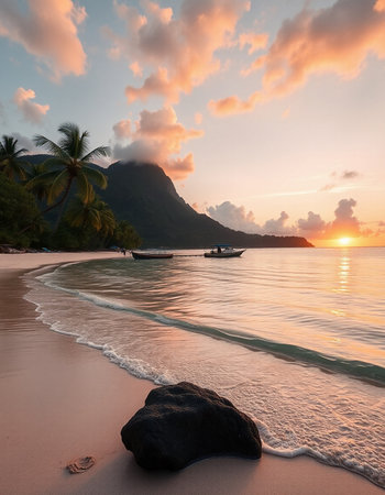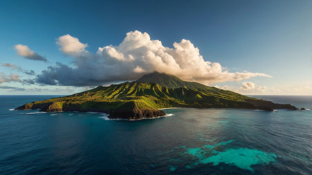 Tropical showing aerial view of a tropical island paradise with lush green mountains, white sand beaches, turquoise ocean water, and dramatic clouds at sunrise...
