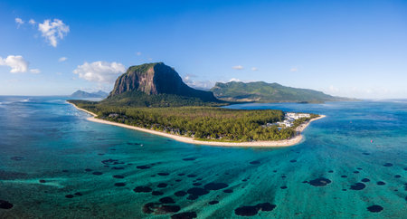 Aerial view of Mauritius island panorama and famous Le Morne Brabant mountain, beautiful blue lagoon and underwater waterfall. Aerial view of Le morne Brabant in Mauriutius.