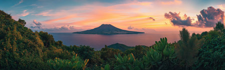 A stunning sunset casts vibrant colors across the sky while revealing a volcanic island in the distance, framed by rich greenery and tranquil waters, creating a serene evening atmosphere.