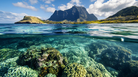 Underwater view of a beautiful coral reef and mountains in the background