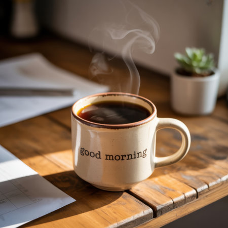 Steaming Good Morning Coffee Mug on a Wooden Desk with Sunlight