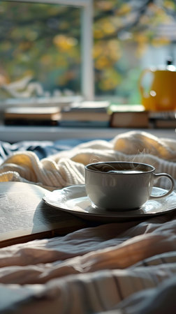 A cup of coffee puts on bed with aroma candle and book in winter season with blurred city background. Zen and relax concept.