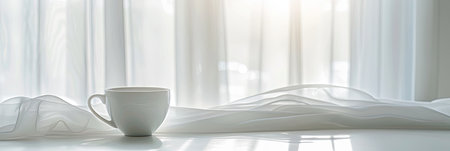 A simple white coffee cup stands on a white table in front of a window with sheer white curtains. The curtains are drawn, and the sun is shining through them, creating a soft, ethereal glow.