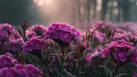 A panoramic wide view of Sweet William field growing closely together in a dewy morning shining droplets on leaves warm soft daylight ultra realistic photography cinematic wide composition lifelike natural scene