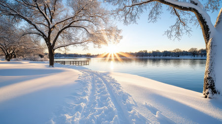 An enchanting snapshot ideal for nature and travel publications, seasonal greetings, or environmental awareness campaigns | This serene photograph showcases the tranquil beauty of a winter landscape, where the golden morning sun filters through a forest of snow-laden trees. The frosted branches bow gracefully under the weight of the snow, their white tips glistening against the soft glow of the sunrise. The sun's rays pierce the misty air, adding a warm, ethereal quality to the cool blue and white hues of the scene. A small, calm body of water reflects the forest and sunlight, enhancing the stillness of the early morning hour. The contrast between the chill of the snow and the warmth of the sunlight exemplifies the harmony of nature's elements. The softness of the snow-covered ground and the gentle arc of the trees' branches invite contemplation and a deep appreciation for the season's quiet beauty | Suited for use in contemplative and inspirational settings, such as meditation and wellness guides or as tranquil visuals in weather and climate change discussions. It also has potential as a captivating backdrop for holiday marketing, outdoor adventure promotion, or as a peaceful visual element for home and office decoration, attractive to nature lovers and photography enthusiasts | a stunning photo of a snowy scene in a forest with trees and a body of water, illuminated by sunrise and reflecting a mixture of calmness and vitality, with ample space for text or design elements