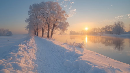 A tranquil winter scene unfolds as the sun rises, casting a warm golden glow across a snow-covered landscape. A calm river reflects the sky, with trees and a house visible in the distance.