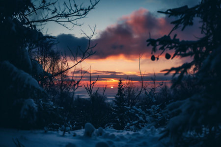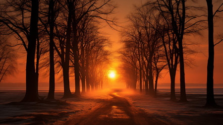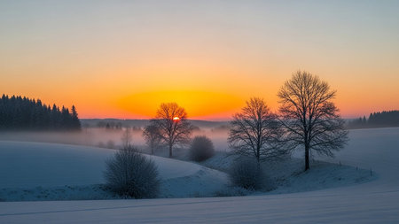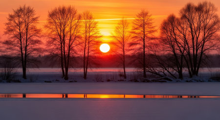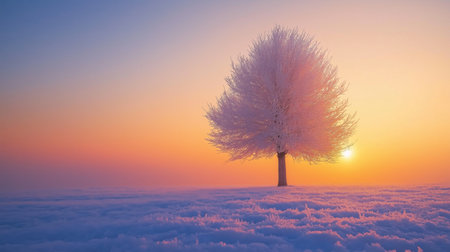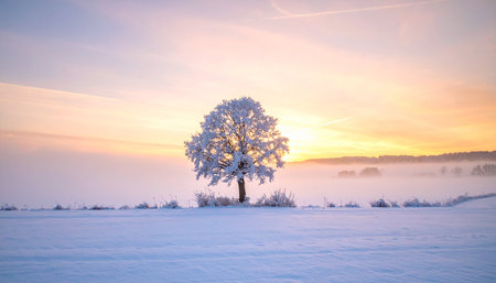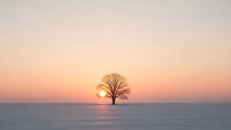 Stunning winter landscape sunset serene snowy field majestic bare tree silhouette vibrant colorful sky tranquil nature scene copy space peaceful outdoor beauty