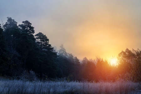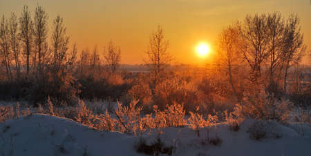 Sunrise over a field covered with hoarfrost on a cold winter morning
