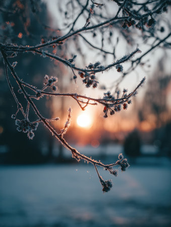 Frost-covered branches frame a stunning sunrise, casting warm hues against the cold winter scenery in a tranquil outdoor setting.