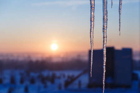 Long and thin icicles on the background of a beautiful winter dawn. Winter landscape at dawn on a frosty morning.