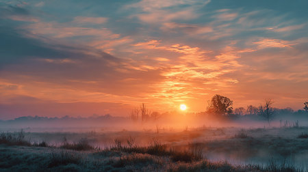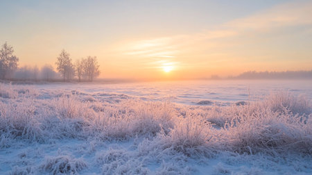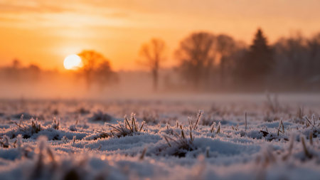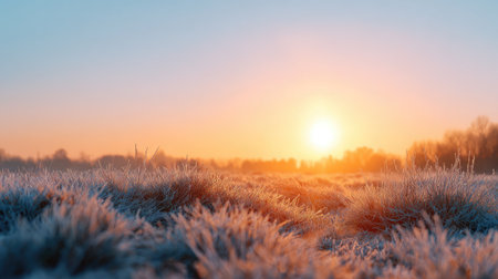 A stunning winter sunrise casts warm hues over a frosted grass field. The image captures the tranquility of nature, a perfect morning landscape to inspire serenity and peace.