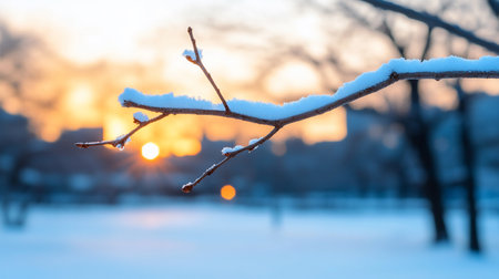 A close-up view of a bare tree branch heavily laden with fresh white snow, set against a soft, out-of-focus backdrop of a winter sunset.