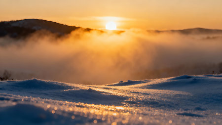 A breathtaking winter sunrise casts golden light over a frozen lake, illuminating the glistening snow. This serene landscape evokes feelings of peace and tranquility.