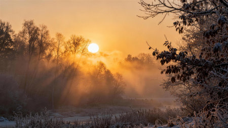 Stunning wintry sunrise over a chilly river, glistening reeds and a misty landscape in harmony