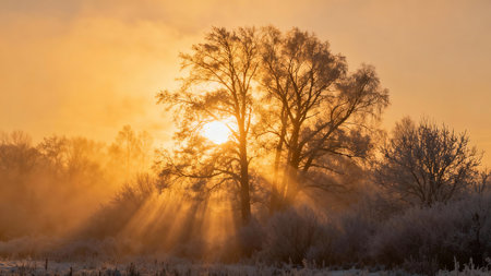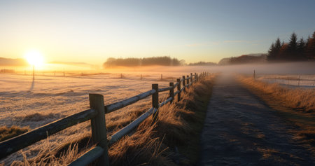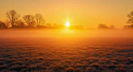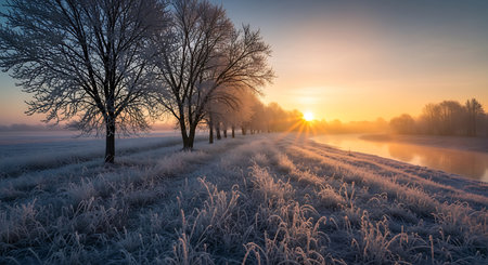 A stunning view of a frosty sunrise illuminating a tranquil field, with golden rays breaking through the cold morning scene, capturing nature's serene beauty.