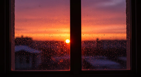 Frosted glass reveals a stunning sunrise over a snowy landscape, with condensation creating a cozy atmosphere. Nature's beauty fills the air as morning light breaks through.