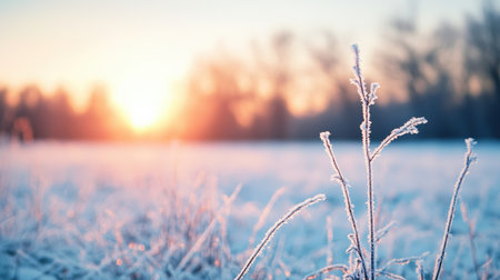 Frosty grass glistens in the early morning sunlight at a serene winter landscape