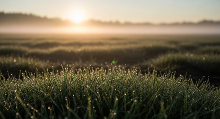 A serene golden sunrise breaks through a soft morning mist, illuminating a field of lush green grass covered in sparkling dew droplets. The sun's warm rays create a gentle glow, casting long shadows and highlighting the intricate details of the wet grass. The background fades into a hazy silhouette of trees, emphasizing the vastness and tranquility of the natural landscape. The evokes a sense of peace and the quiet beauty of a new day dawning.