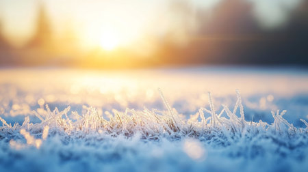 A frost-covered ground in a park, with delicate ice crystals on grass blades, under the golden light of a winter morning -