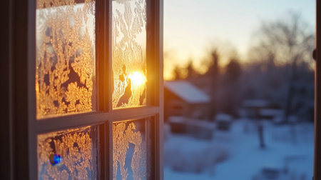 A stunning winter sunset shines through a frosted window, creating a warm atmosphere in a cozy cottage while the serene snowy landscape adds a touch of tranquility.