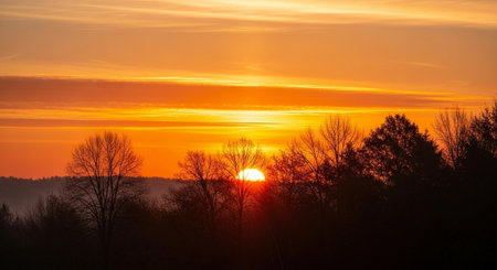 a stark silhouettes of trees stand tall against a winter sky during the golden hour of sunset. The contrast between the dark, intricate branches and the warm, soft hues of the setting sun