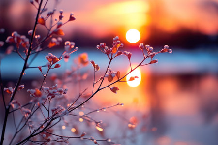 Frosty branches frame glowing sunrise over frozen landscape. Golden light creates serene winter horizon with icy detail