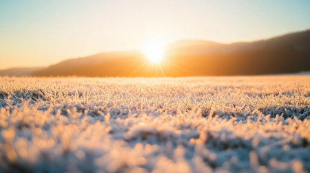 frost-covered grass with a bokeh background of rising sun, created with generative ai