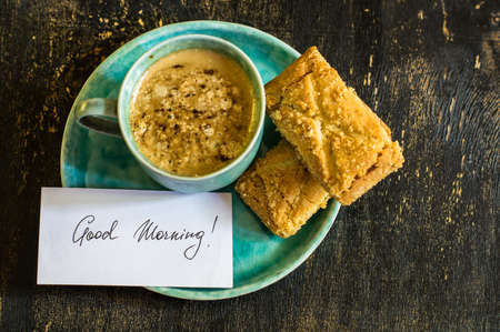 Cup of coffee and good morning note on wooden background with copy space