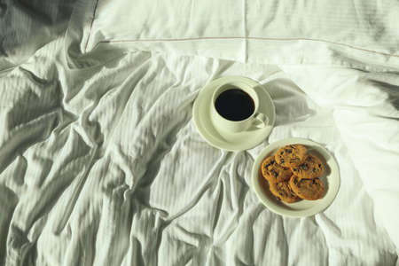 Cup of coffee and cookies on the bed