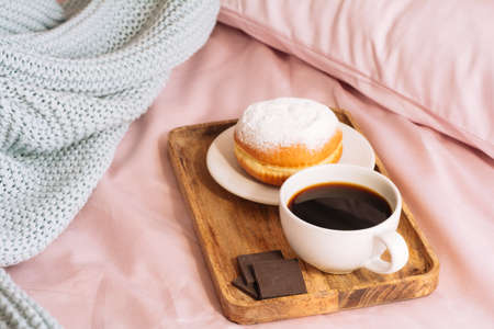 Morning breakfast in bed with fresh and hot bracing coffee, a doughnut in powdered sugar and three slices of chocolate on a wooden tray against a backdrop of pink sheets and blue plaid