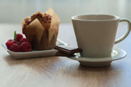 Morning aromatic coffee with a muffin raspberries and chocolate for Breakfast.