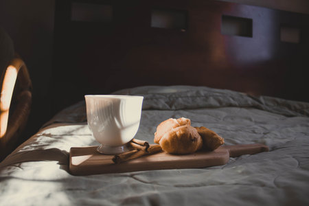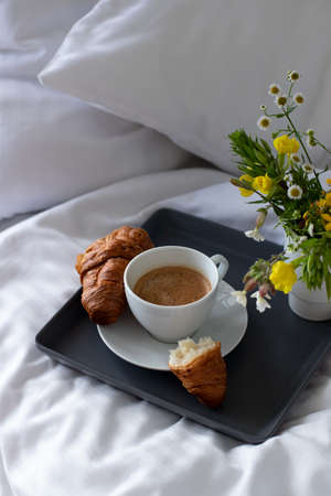 Early morning breakfast in bed, coffee and croissant on the tray