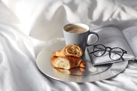 croissants, cup of coffee and book in bed at home