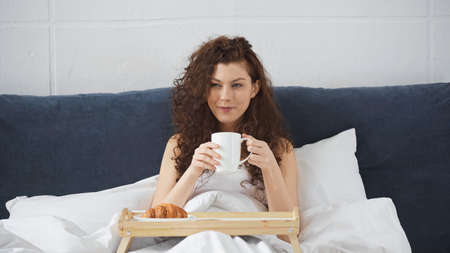 smiling woman holding cup of coffee near tray with croissant on bed