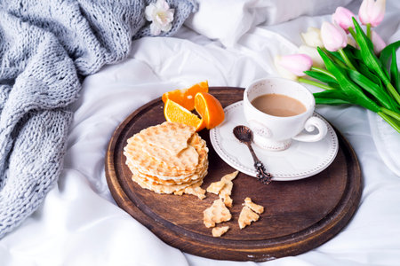 wooden tray with a cup of coffee with milk, waffles and oranges on a white pastel with tulips and a knitted plaid, copy space flat lay