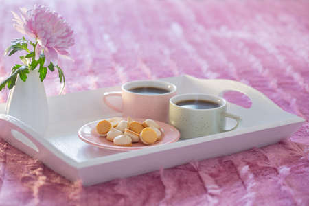 Breakfast in bed with hot coffee and macaroons. Healthy breakfast kept on bed with books and flowers Close up of a cup of coffee with cookies, fresh juice and grapefruit on wooden tray in bed. Toned