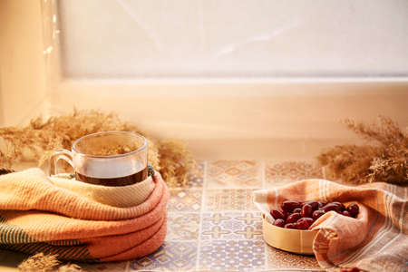 Natural healthy calming drink with dogwood berry. Autumn healthy food. Pastel colors with copy space. Healthy organic food. Vitamin tea. Home coziness, decorations table. High quality photo