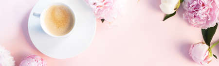 Beautiful fresh pink and white peony fresh flowers on pink table with cup of coffee, frame with copy space for your text, top view and flat lay background