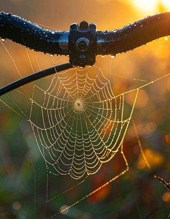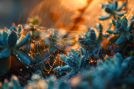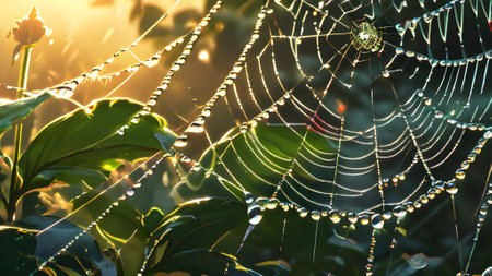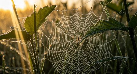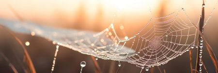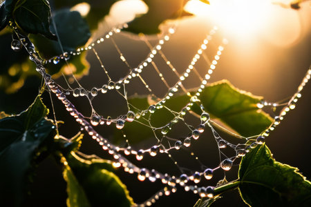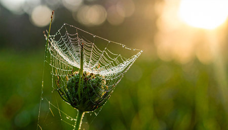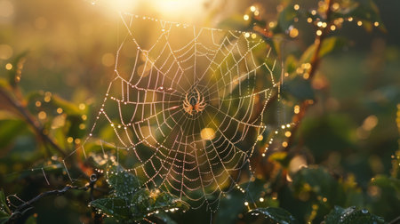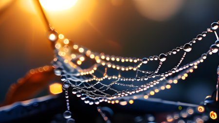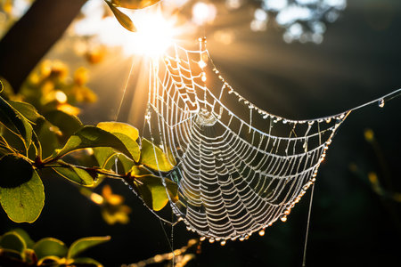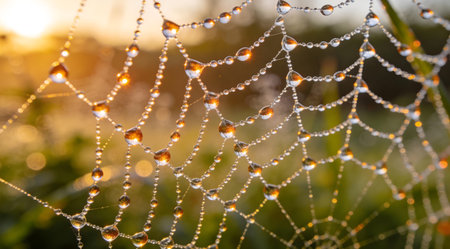 Delicate spiderweb adorned with morning dew glistens in the warm sunlight.