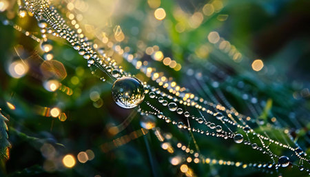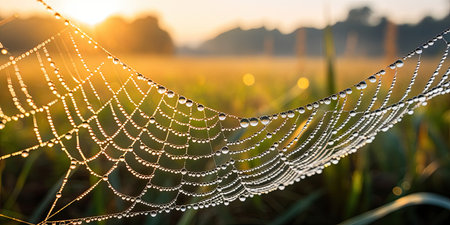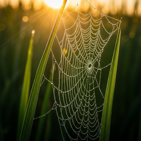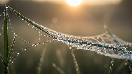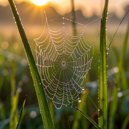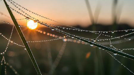 As the sun rises, its golden rays catch the delicate threads of a spiderweb, turning countless dew drops into sparkling jewels.