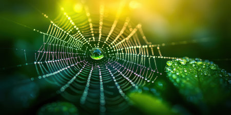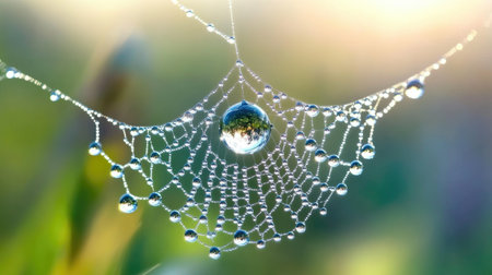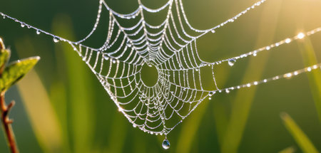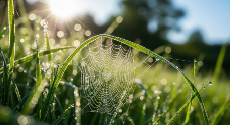 Sparkling dew drops cling to a delicate spider web in a vibrant green meadow, creating a mesmerizing scene of natural beauty in the early morning light