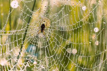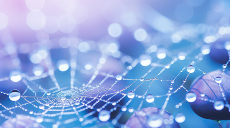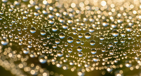 Delicate spiderweb adorned with countless glistening water droplets, creating a beautiful natural pattern and sparkling bokeh effect.