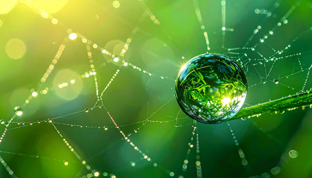 As the sun rises, its golden light catches a perfect sphere of morning dew, suspended like a precious jewel on an intricate spiderweb. This macro view captures a moment of pure, fragile beauty, reflecting the lush green world within its tiny lens and symbolizing clarity, new beginnings, and the delicate interconnectedness of nature.