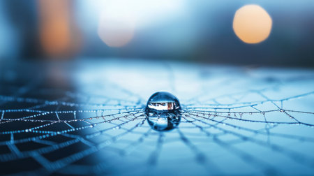 A clear dewdrop rests on a spiderweb, reflecting an inverted image. The web is adorned with smaller droplets, all in cool blue hues.
